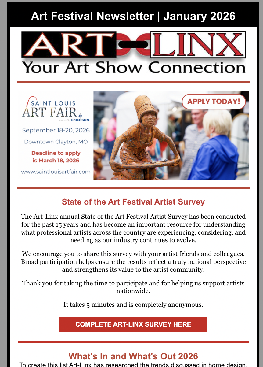 Click HERE to read the current issue of The Art Festival Newsletter: What’s In and What’s Out 2026; What’s in Your Studio Right Now?; A Creative Way to Set Goals for 2026; Take the State of the Artist Survey; 2026 Resolution Bingo